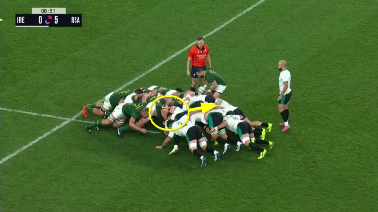 The three on two is created by the Springbok tighthead Thomas du Toit setting up on a slight inward angle, to emphasise Porter’s tendency to swing his hips out to the left under pressure. As the scrum develops the Leinster loosehead will be left on the side of the scrum as ‘the Tank’ rolls through the gap between him and Sheehan, while Marx and his loosehead Boan Venter play the two on one against Furlong on the other side. In contrast to the World Cup quarter-final, there is no argument because Porter is going backwards, not forwards.